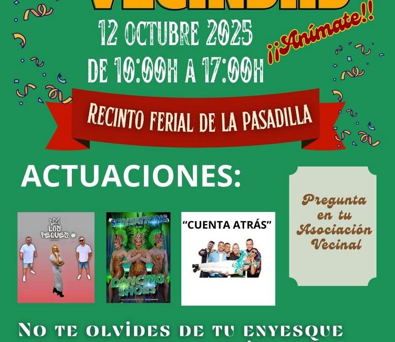 El domingo 12 de octubre, el Recinto Ferial de La Pasadilla acogerá la celebración del Día de la Vecindad 2025, una jornada dedicada a la música, la diversión y la convivencia ciudadana. La iniciativa, organizada por el Ayuntamiento de Ingenio a través de la Concejalía de Participación Ciudadana en colaboración con las asociaciones vecinales, se desarrollará de 10:00 a 17:00 horas e incluirá un variado programa de actividades para toda la familia.