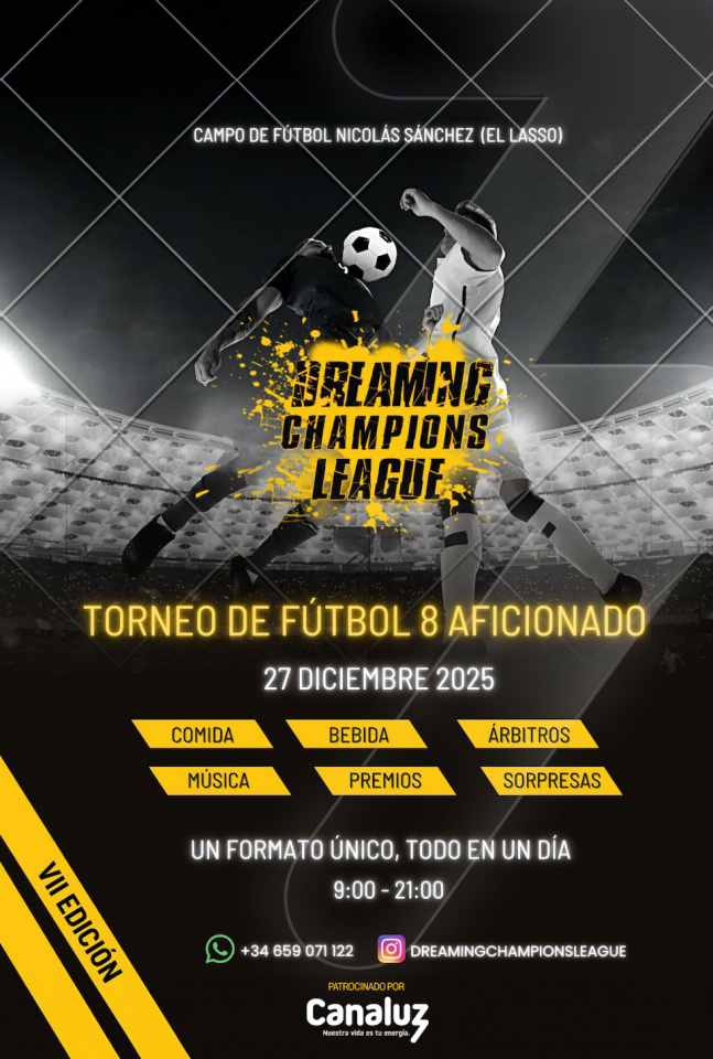 La séptima edición de la Dreaming Champions League (DCL) ya calienta motores para su celebración este 27 de diciembre de 2025 en el Campo de Fútbol Nicolás Sánchez, en El Lasso (Las Palmas de Gran Canaria). Este torneo de fútbol aficionado, que se ha convertido en una referencia dentro del panorama deportivo insular, contará en esta ocasión con el apoyo de Canaluz como patrocinador oficial del evento.