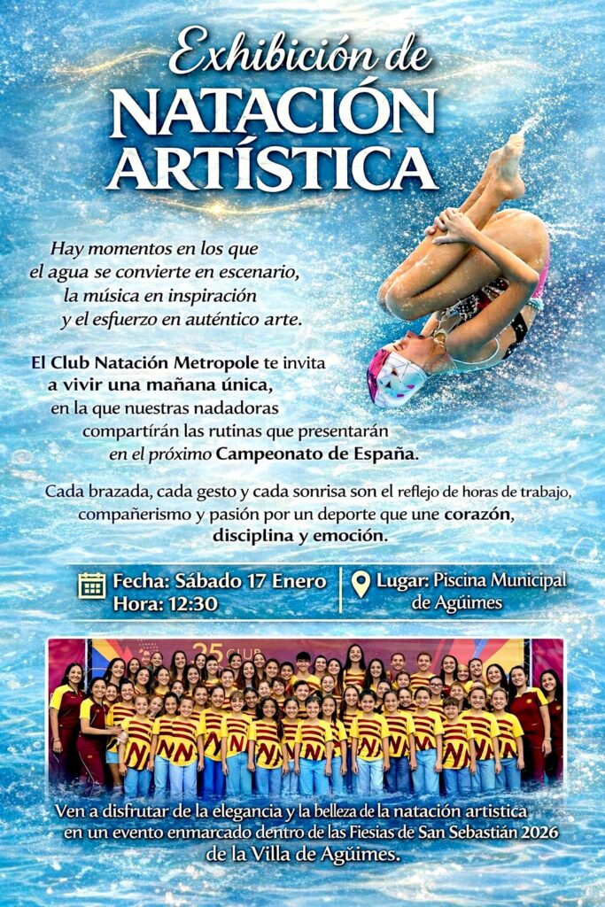 El próximo sábado 17 de enero, a las 12:30 horas, la Piscina Municipal de Agüimes acogerá una Exhibición de Natación Artística a cargo de las nadadoras y nadadores del Club Natación Metropole. Este evento supone una excelente oportunidad para que la ciudadanía de Agüimes pueda disfrutar, por primera vez en el municipio, de una de las secciones deportivas más laureadas del CN Metropole, club de referencia a nivel nacional e internacional, que ha contado entre sus filas con medallistas olímpicas formadas en la entidad, como Thaïs Henríquez.