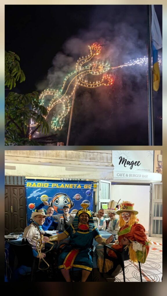Radio Planeta Gran Canaria realizó un despliegue a lo grande con más de tres horas de emisión en directo desde la cuna del Carnaval, Agüimes, impregnado de los colores y la alegoría de África. Un año más —y ya van 23— llevamos a cabo el primer directo en la calle, emitiendo desde la zona del Ayuntamiento, en la calle Juanquín Artiles nº 14, gracias a la gentileza de Magec Coffee & Food, que volvió a abrirnos sus puertas y a sumar su apoyo a esta gran fiesta.