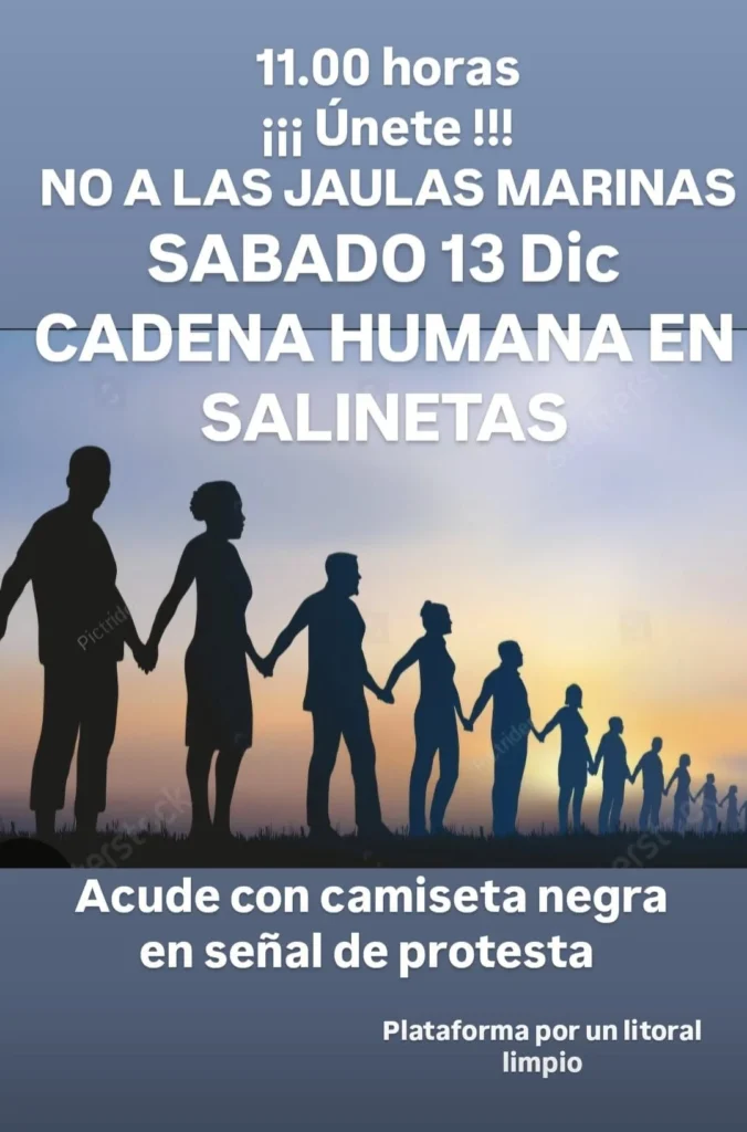La Plataforma se reunirá este jueves para cerrar los detalles de la movilización, insistiendo en la importancia de contar con una participación masiva. El cartel de la convocatoria lo resume así: «Únete. No a las jaulas marinas. Sábado 13 de diciembre. Cadena humana en Salinetas. Acude con camiseta negra en señal de protesta».