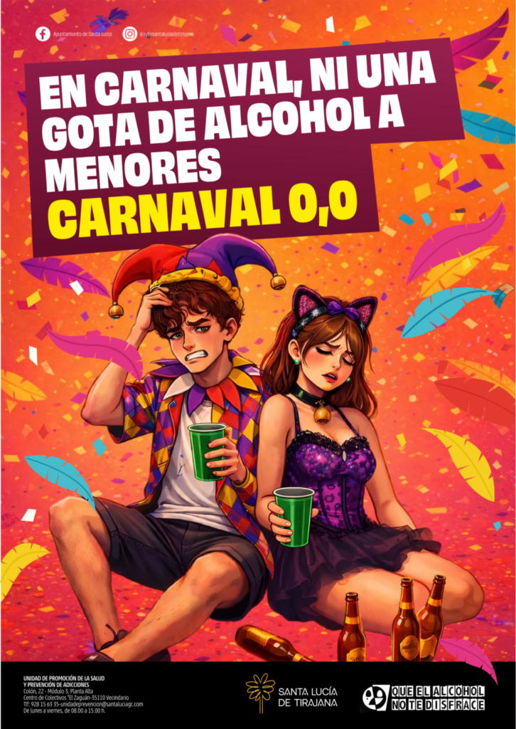 La campaña también se desarrolla en los centros educativos del municipio con alumnado de 3º de ESO, donde se ha organizado un concurso de spots preventivos. Asimismo, se ha distribuido cartelería en los comercios situados en el recorrido de la cabalgata del carnaval y se ha instalado un anuncio en una marquesina de la Avenida de Canarias con el lema: “Ni una gota de alcohol a menores – Carnaval 0’0”.